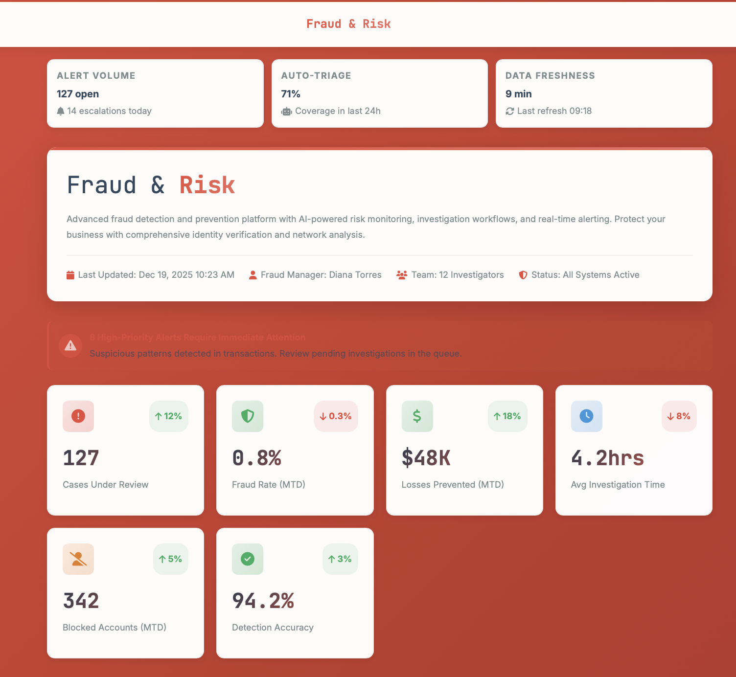 | #INV-2847 | Diana Torres | Account Takeover | Critical | Dec 19, 09:23 | 1.2hrs | Active |